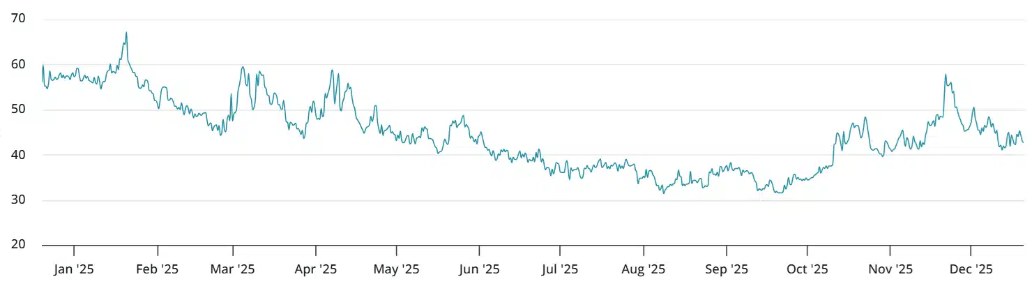 Além disso, a demanda defensiva cresceu. As puts da IBIT passaram de desconto de 2% para prêmio de 5%. Enquanto isso, a volatilidade implícita caiu para 45%, reduzindo os ganhos dos vendedores de opções.