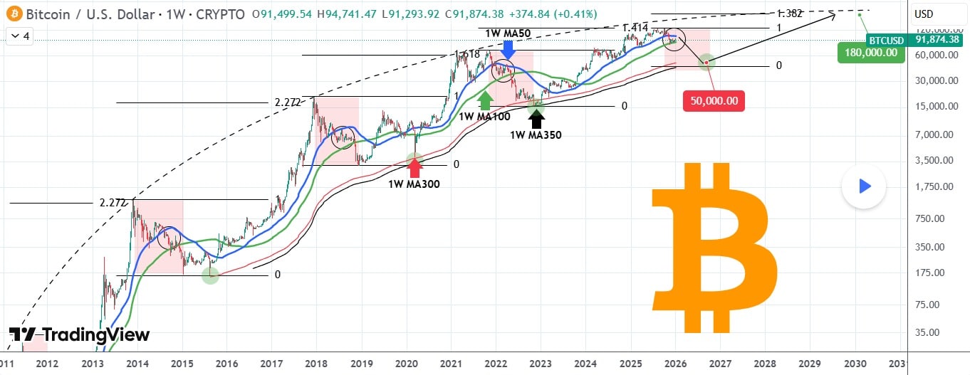 A projeção otimista de longo prazo deriva da curva de crescimento parabólico do Bitcoin e do comportamento das extensões de Fibonacci ao longo dos ciclos. A análise identifica a extensão 1,382 como o nível mais provável para o próximo topo, o que colocaria a nova máxima perto de US$ 180 000. Essa previsão indica um potencial de valorização de cerca de 95% em relação ao preço atual de US$ 92 084.