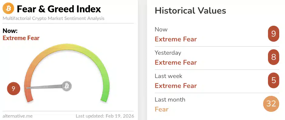 Apesar desse descompasso entre os ativos, o clima geral segue pressionado. O índice de medo e ganância permanece em território de “Medo Extremo”, mesmo após o Bitcoin reagir levemente das mínimas próximas de US$ 60.000 no início de fevereiro.