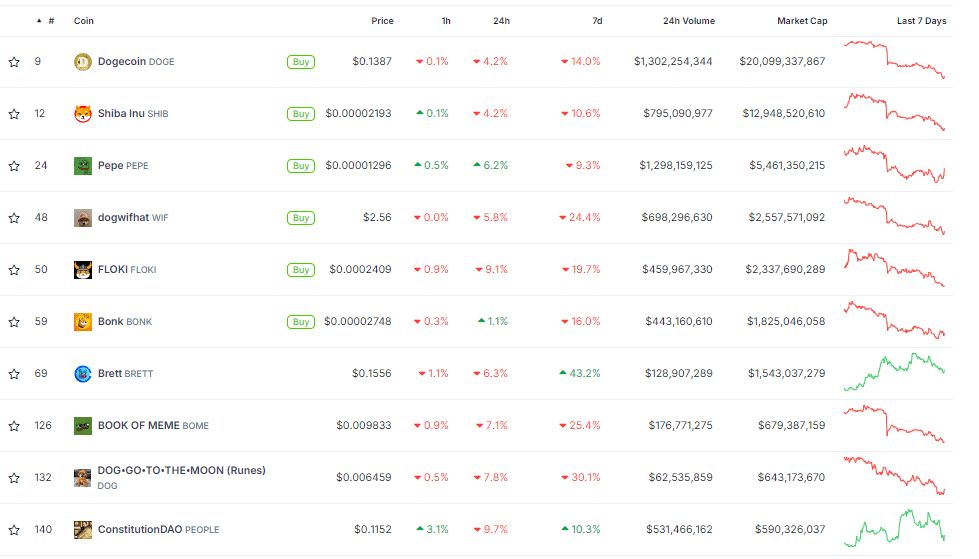 De acordo com o CoinGecko, as maiores memecoins em junho de 2024 são: DOGE, SHIB, PEPE, WIF, FLOKI, BONK, BRETT, BOME, DOG e PEOPLE. Importante destacar que a DOGE não só é a maior memecoin em termos de valor de mercado, mas também é a nona maior criptomoeda do mundo.