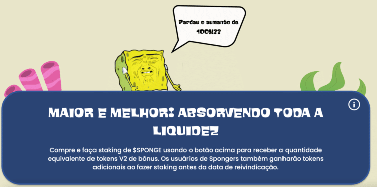 - Staking em $SPONGE V1: Bloqueie os tokens V1 adquiridos no novo contrato inteligente V2 para começar a receber as recompensas de staking em tokens V2.