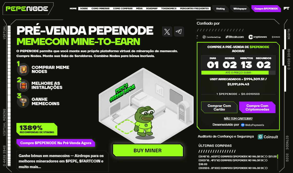 O mercado cripto não dorme, e a nova febre tem nome, rosto e proposta: PepeNode. Em plena temporada de hype das memecoins, um projeto que mistura humor, mineração virtual e recompensas explosivas já ultrapassou US$ 995 mil em arrecadação na pré-venda, com expectativa de chegar ao limite de US$ 1,09 milhão nas próximas horas.
