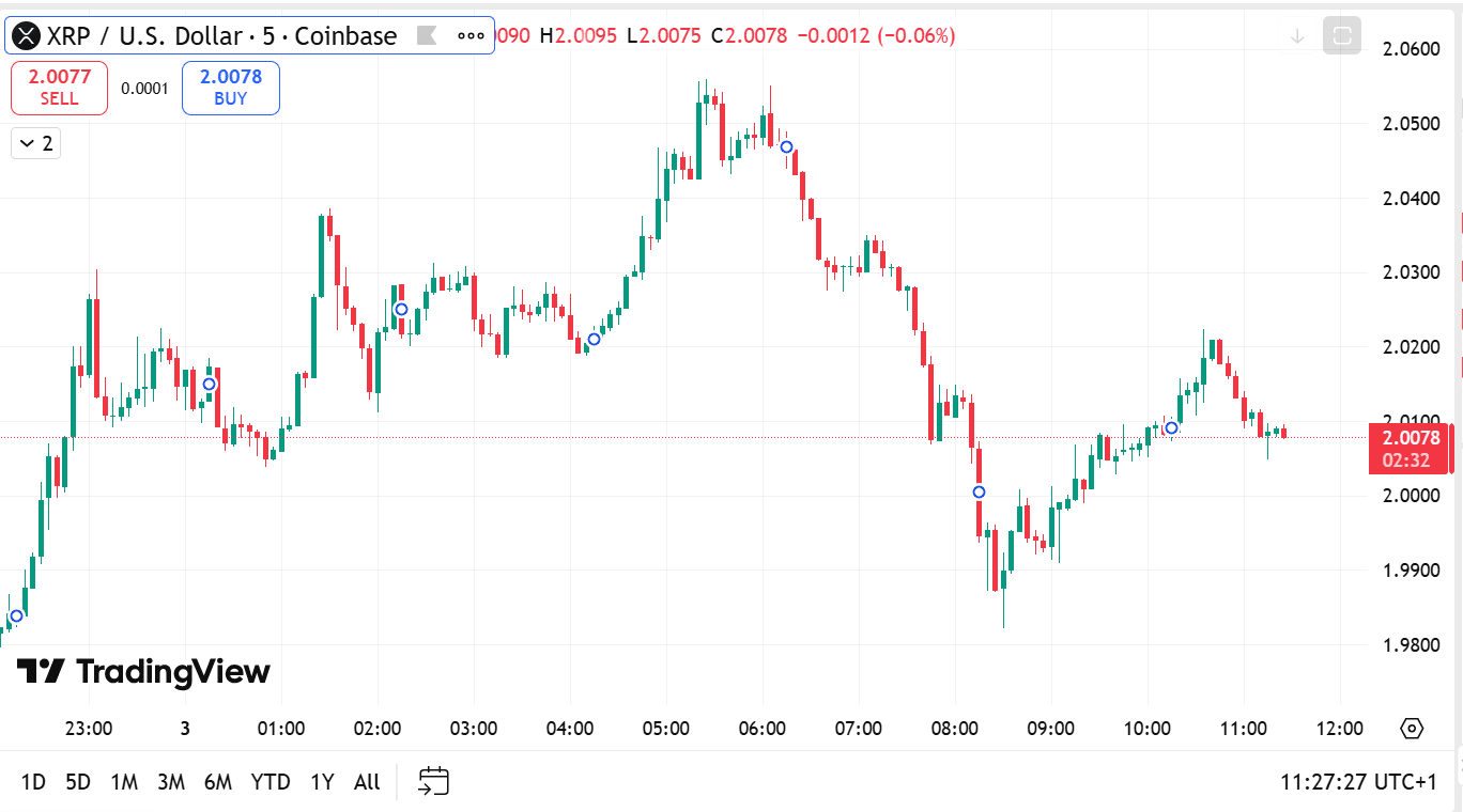 O XRP está sendo negociado a US$ 2,00, com capitalização de mercado de US$ 122,54 bilhões e volume de negociação de US$ 4,28 bilhões em 24 horas. O volume aumentou 181,19% nas últimas 24 horas. O XRP também avançou 6,91% no período, acumulando alta superior a 9,18% no dia.