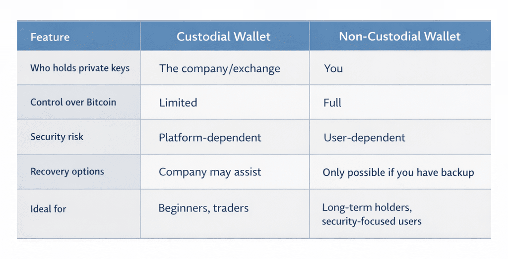 Carteiras custodiais são práticas para negociação e para iniciantes, mas exigem confiança na empresa que gerencia seus fundos. Sempre pesquise as medidas de segurança da plataforma antes de armazenar valores significativos de Bitcoin.