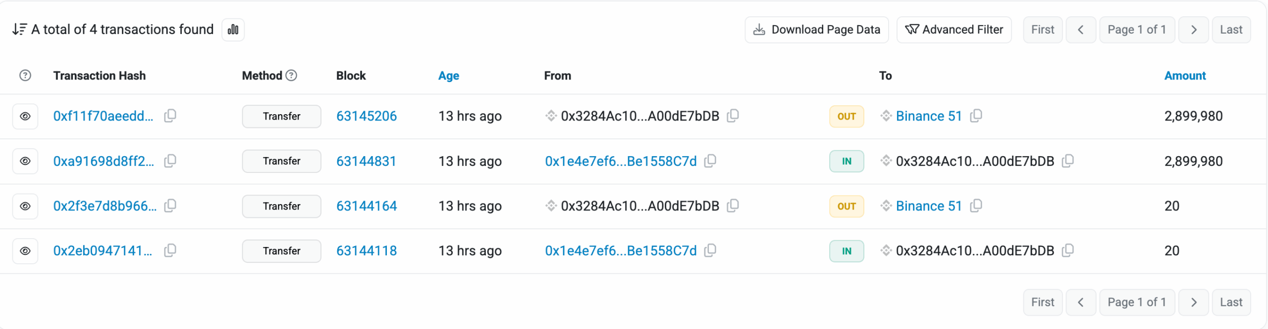 O ASTER também aparece como forte candidato à listagem. Dados do BscScan revelaram transferências relevantes para carteiras da Binance. Primeiro, um envio de teste de 20 ASTER. Em seguida, uma transação de US$ 4,8 milhões, sinal claro de movimentação institucional.