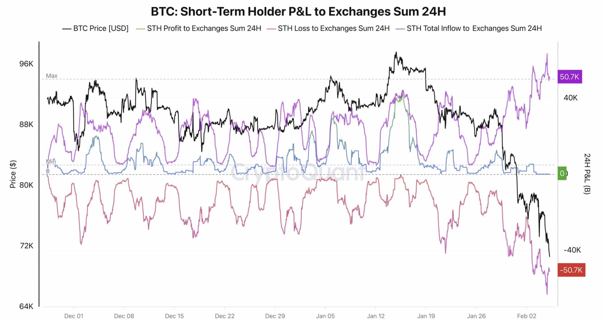 Os dados revelam que investidores de curto prazo, conhecidos como STHs, enviaram quase 60.000 BTC para corretoras com prejuízo nas últimas 24 horas. O movimento, avaliado em cerca de US$ 4,2 bilhões, evidencia forte desespero entre detentores que seguraram o ativo por menos de 155 dias, reforçando a avaliação do analista da CryptoQuant, Darkfost, de que a correção atual é tão severa que nenhum Bitcoin em lucro está sendo movimentado pelos detentores de longo prazo (LTHs).
