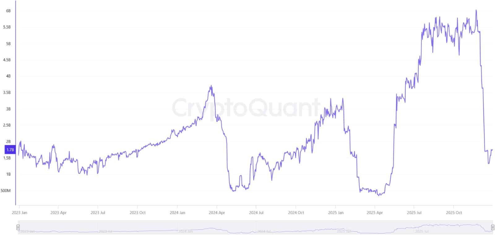 Os dados mostram um deslocamento claro entre mercados. As stablecoins migraram do mercado à vista para o de derivativos, que agora detém US$ 64 bilhões, mesmo após registrar um pico acima de US$ 68 bilhões em novembro. Já as reservas à vista recuaram de US$ 5,7 bilhões para apenas US$ 1,3 bilhão, segundo números da CryptoQuant.