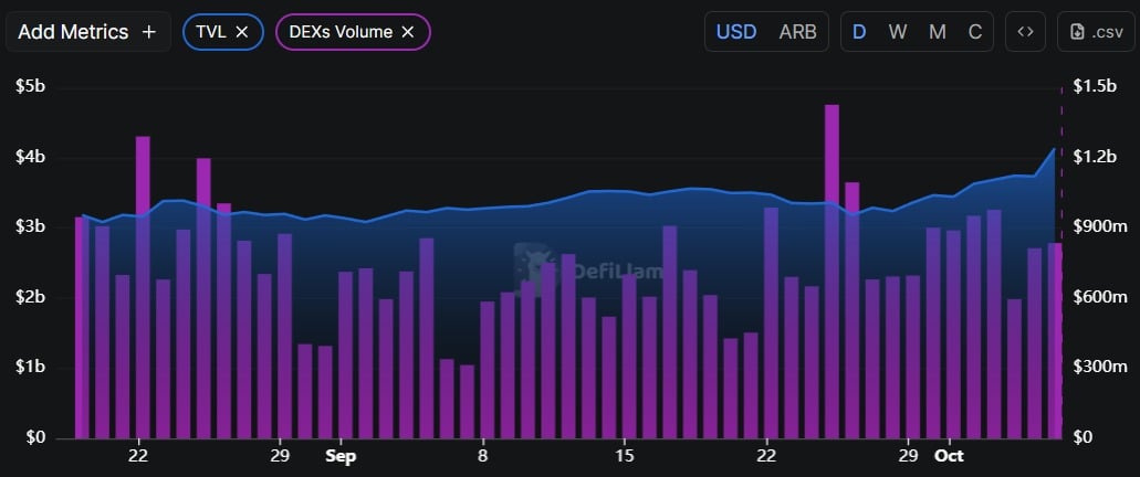 Esse avanço não aconteceu isoladamente. O volume nas exchanges descentralizadas (DEX) da rede também aumentou, subindo de US$ 712,6 milhões para US$ 834,7 milhões no mesmo período. Além disso, o valor de mercado das stablecoins na Arbitrum cresceu 5,34%, alcançando US$ 4,15 bilhões. Esses três fatores combinados revelam um retorno de liquidez e confiança, o que pode preparar o terreno para uma valorização expressiva do token ARB.