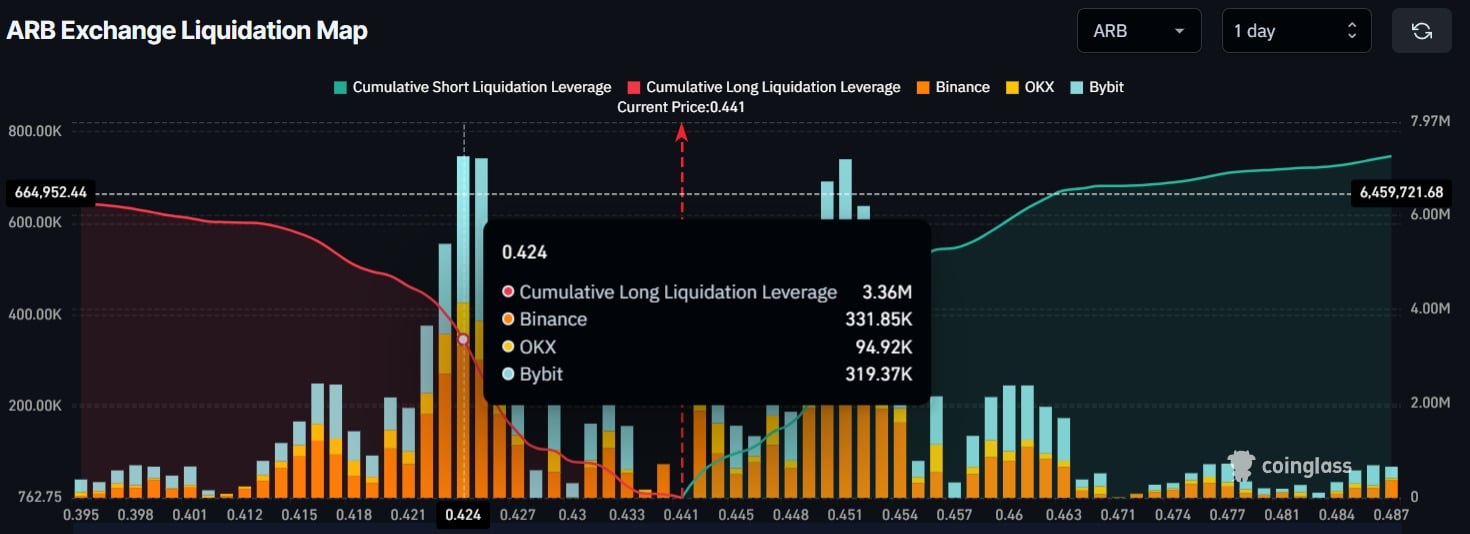 Mesmo com a leve correção nas últimas 24 horas, quando o ARB recuou 2,5% e registrou volume de US$ 204 milhões, o sentimento de mercado continua positivo. Segundo a CoinGlass, as posições longas superam as curtas, totalizando US$ 3,36 milhões contra US$ 2,75 milhões, concentradas entre os níveis de US$ 0,424 e US$ 0,451.