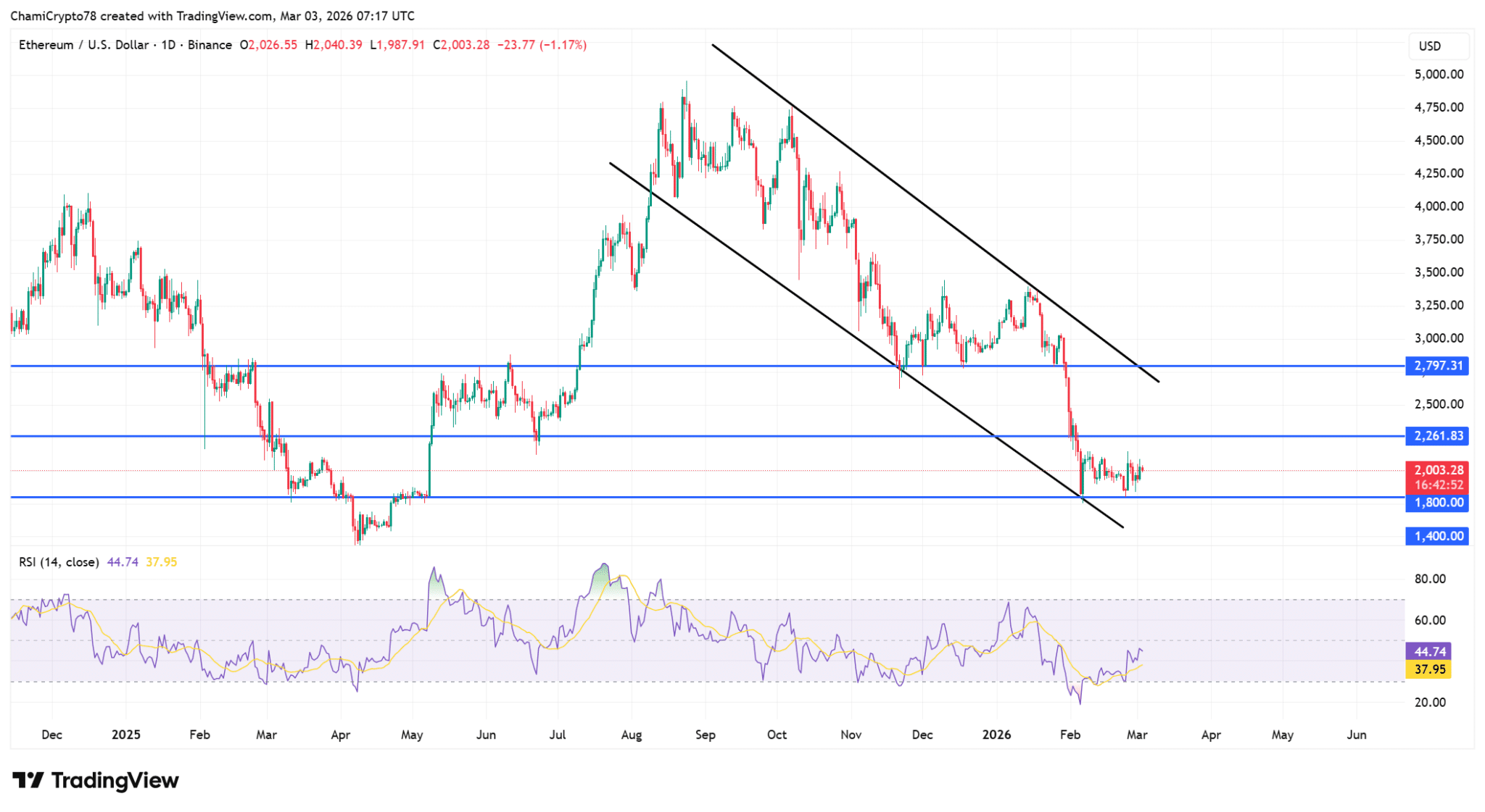 O Ethereum tocou a base do canal perto de US$ 1.800 e reagiu de forma intensa. Os compradores defenderam o nível com firmeza, mas a região entre US$ 2.200 e US$ 2.300 ainda limita qualquer avanço.