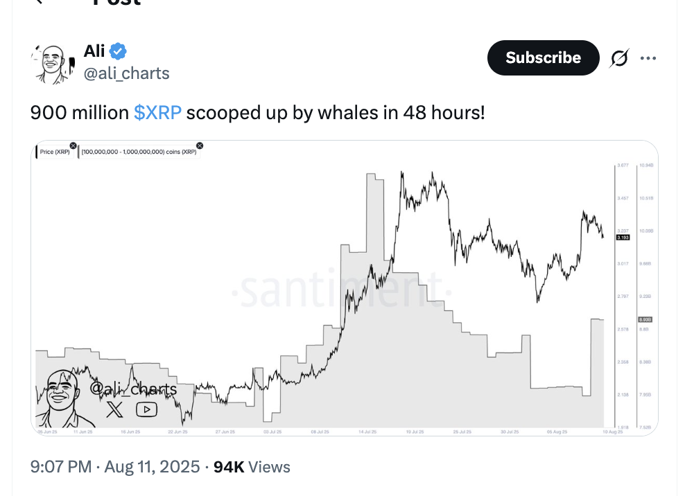 - Baleias acumulam 900 milhões de XRP e reforçam alta