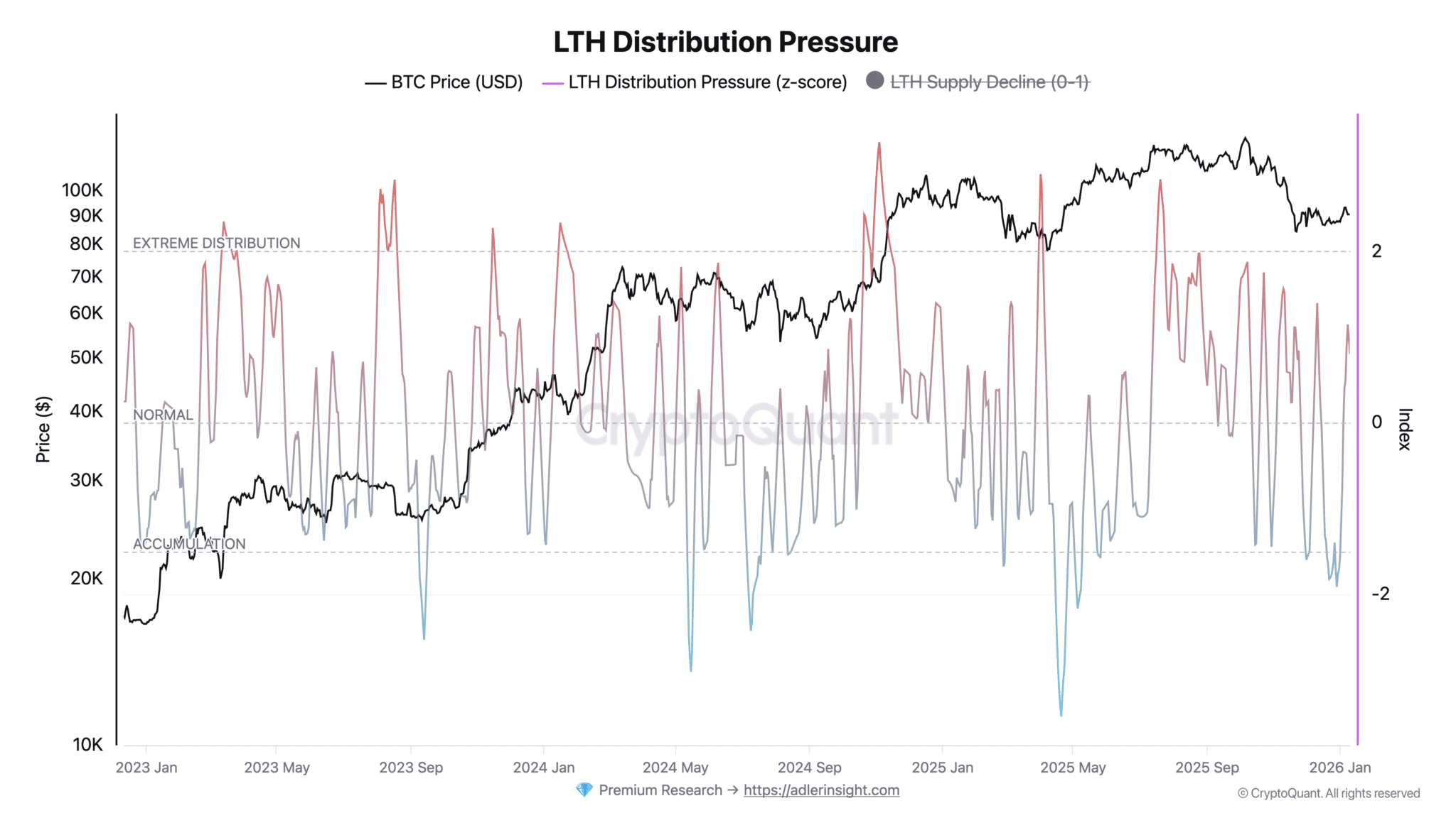 Um relatório do Adler Crypto Insight ajudou a explicar o cenário atual. Axel Adler Jr. apontou que a estrutura de propriedade estável sugere um mercado ainda indeciso. Entre os dias 5 e 11 de janeiro, a parcela realizada pelos detentores com mais de seis meses subiu de 43,29% para 43,69%, sinalizando uma leve migração.