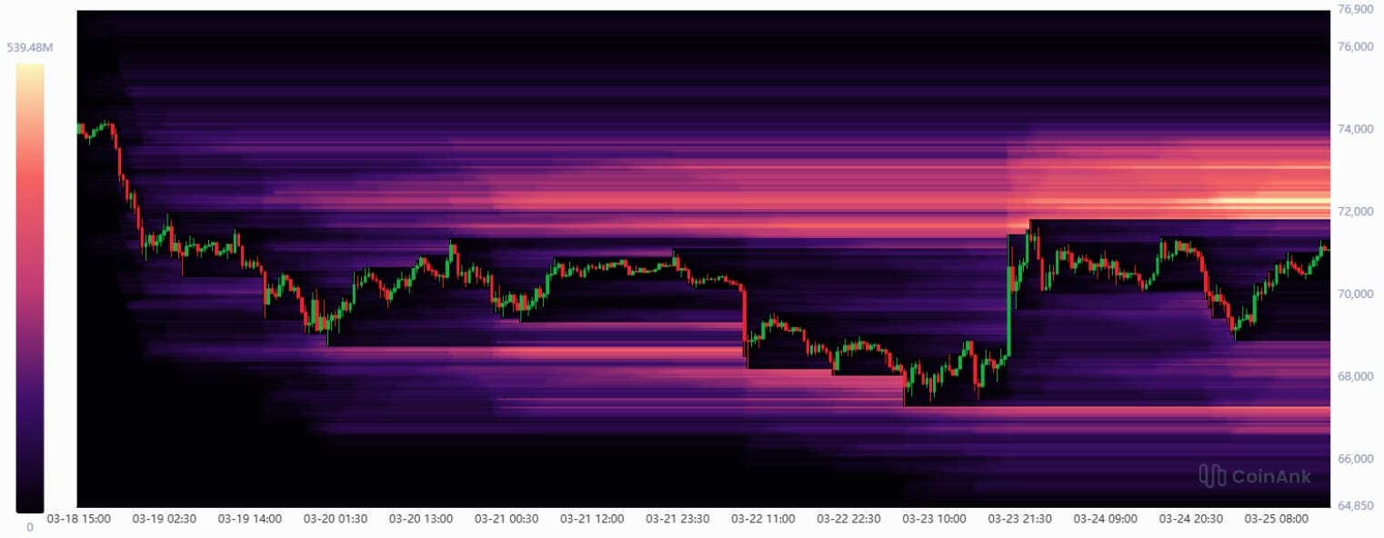 O gráfico do Bitcoin pressionando repetidamente a resistência acima de US$ 70.000. Ainda assim, o preço não consegue se sustentar acima desse nível.
