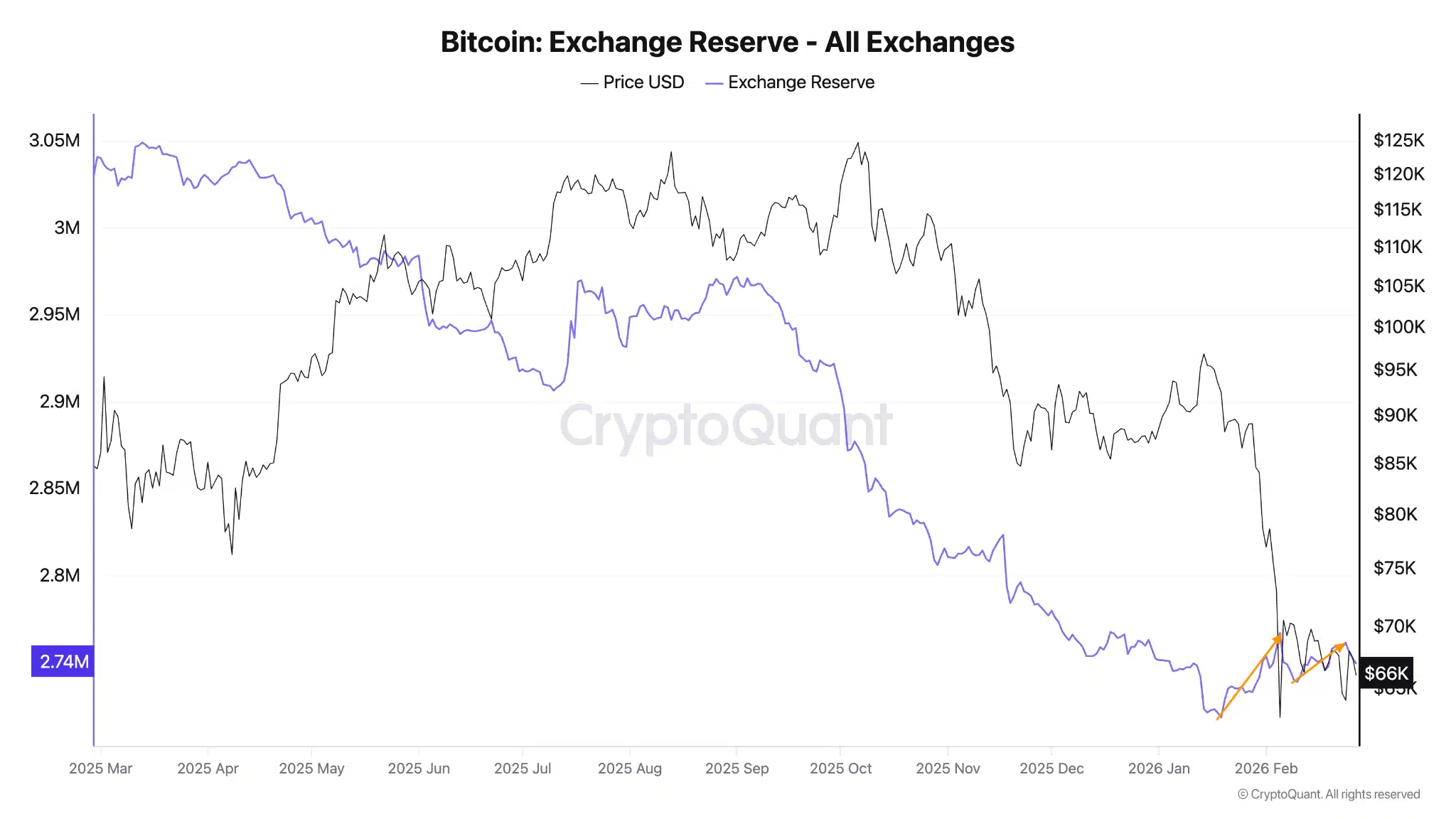 Dados da CryptoQuant também mostram que as reservas de Bitcoin nas exchanges cresceram para 2,752 milhões de BTC, alta de 1% desde janeiro. Esse movimento revela pressão de venda, já que o aumento da oferta nas corretoras indica intenção de distribuição.