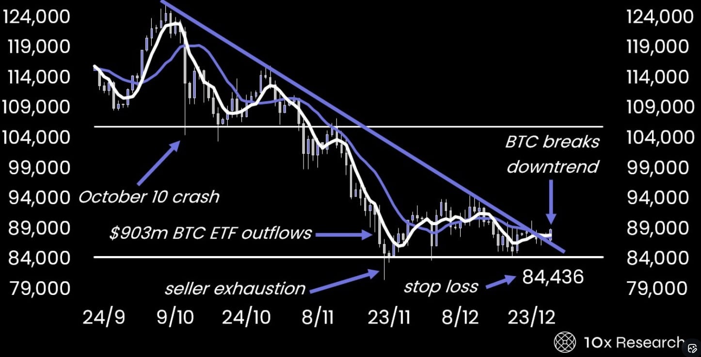 No final de novembro, a 10x Research observou a redução das vendas, já que a maioria dos vendedores de curto prazo havia saído. Mesmo assim, o capital migrou para ouro e prata, reduzindo a força da recuperação. O Bitcoin apenas estabilizou, sem demonstrar força imediata.
