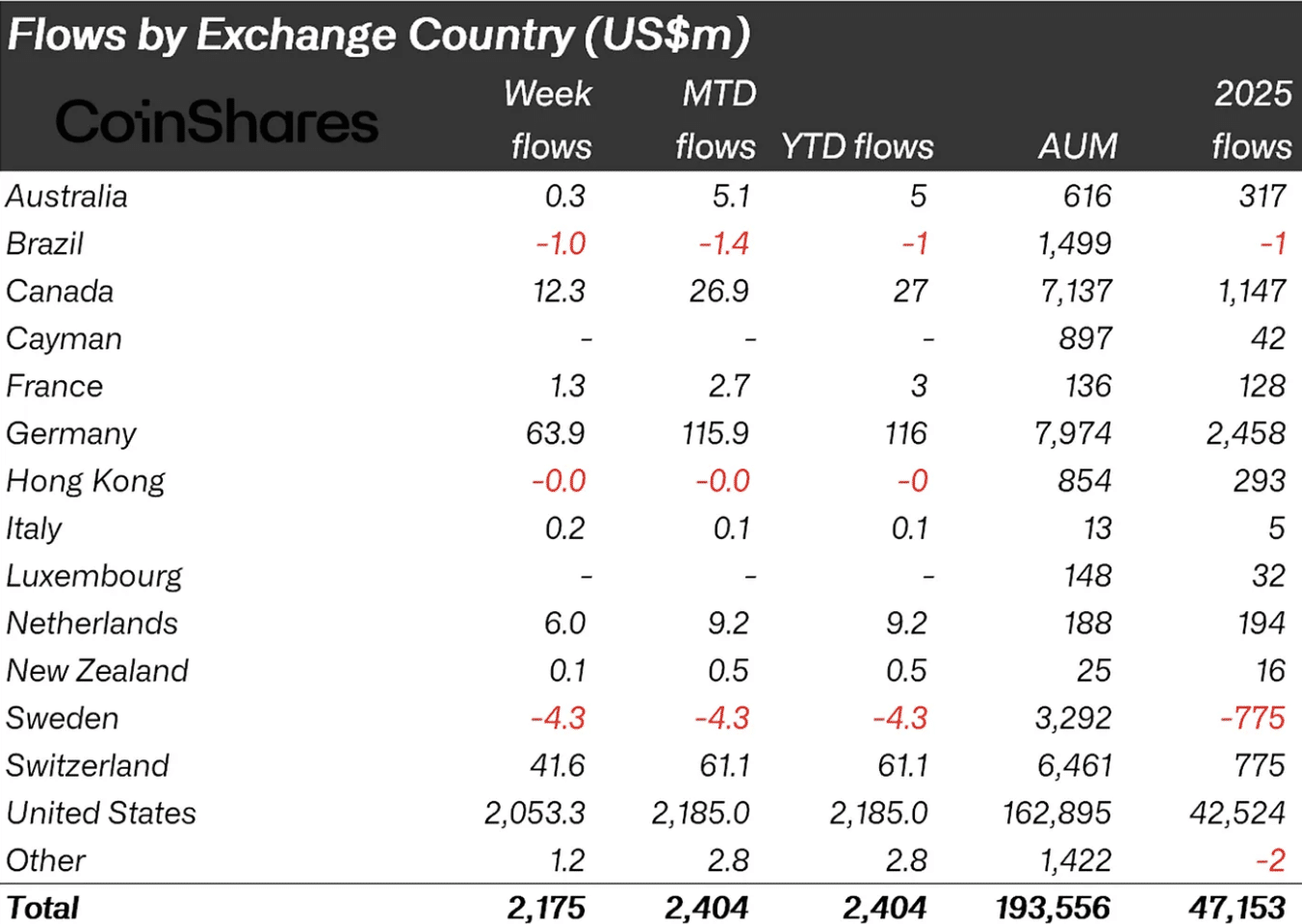 As entradas líquidas totais alcançaram US$ 2,17 bilhões e refletiram um interesse distribuído por diversas regiões. Os Estados Unidos lideraram com US$ 2,05 bilhões e consolidaram o movimento institucional. Além disso, a Europa também avançou, com Alemanha, Suíça e Holanda reportando números positivos.