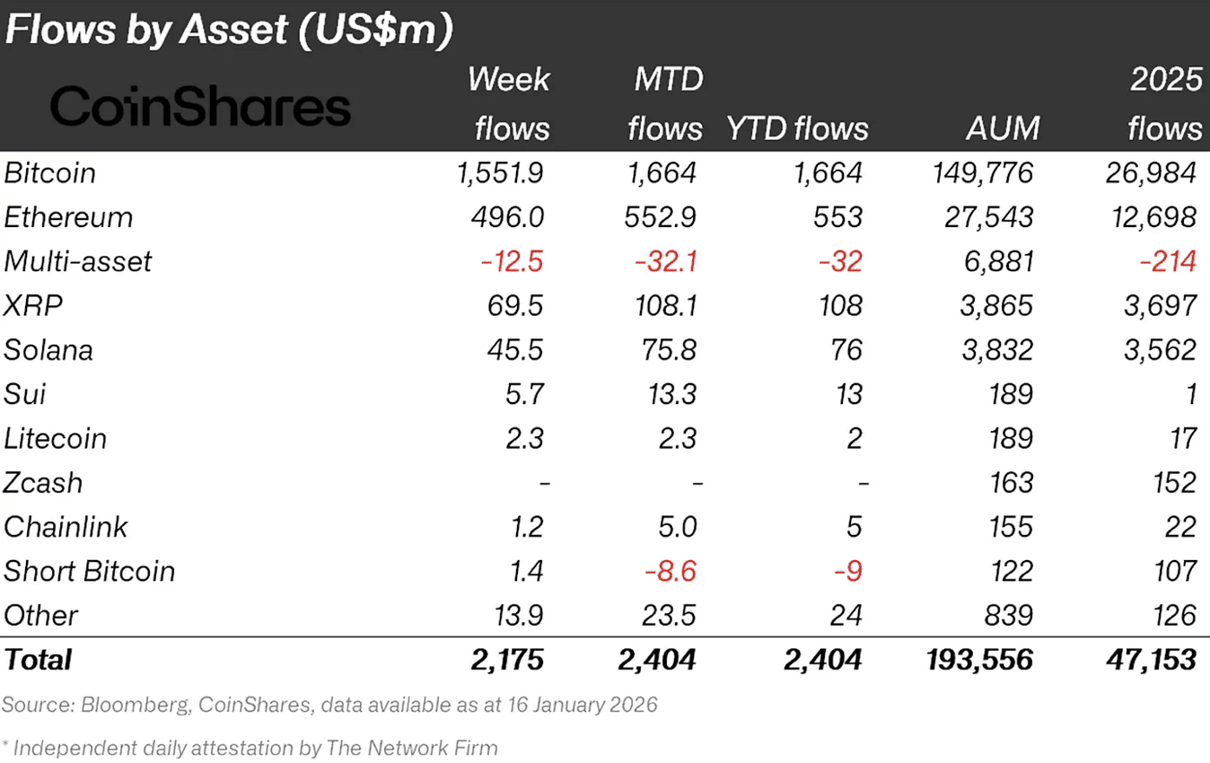 O Ethereum ampliou sua presença e recebeu US$ 496 milhões, enquanto Solana adicionou US$ 45,5 milhões. O avanço também ocorreu entre altcoins selecionadas, como XRP, Sui, Litecoin e Chainlink, todas com fluxo semanal positivo.
