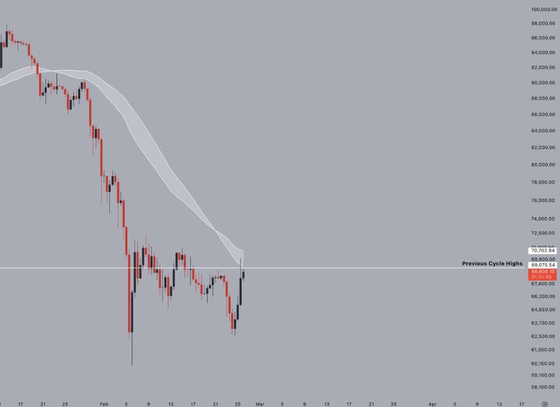 No dia anterior, o Bitcoin havia tocado US$ 70.040 e animado parte do mercado. A tentativa de retomada buscou dois níveis críticos, a EMA de 200 semanas e a antiga máxima de 2021. Mesmo assim, o avanço não durou muito e o preço falhou novamente.