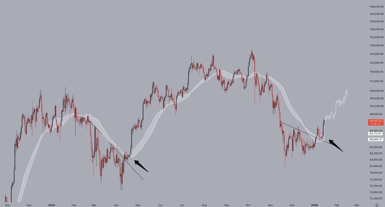 Agora, o gráfico repete elementos semelhantes. O Bitcoin recuou em novembro, consolidou-se em dezembro e rompeu novamente uma linha descendente, voltando a operar acima da faixa da média móvel. O preço permanece perto de US$ 96.880, enquanto US$ 92.113 e US$ 90.083 formam a zona de suporte mais próxima, caso haja uma correção moderada.