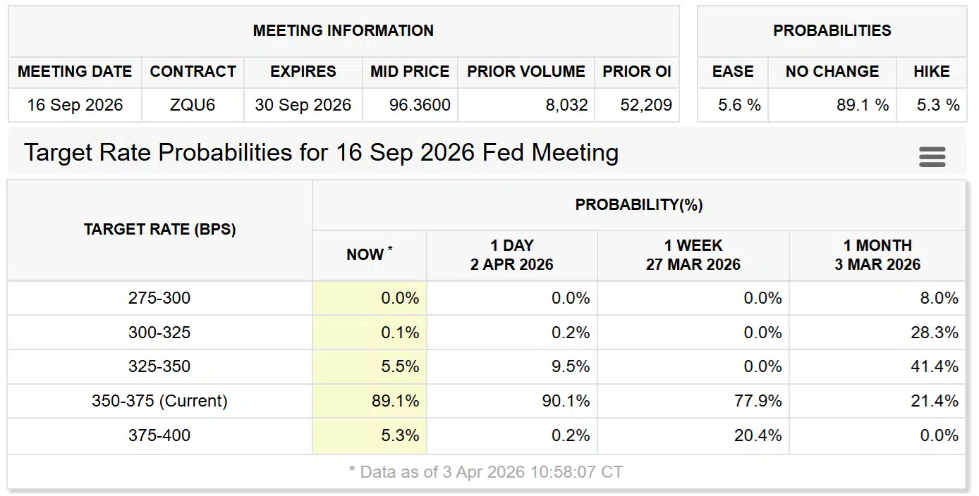As expectativas de juros também mudaram. Hoje, investidores veem 89% de chance de manutenção das taxas até setembro e apenas 5% de probabilidade de alta para 4%.