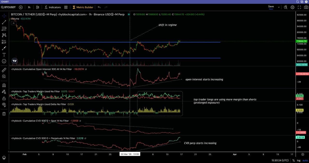 Embora os fluxos à vista tenham melhorado, os derivativos exercem papel relevante. Dados da Hyblock apontam mudança no regime de mercado.