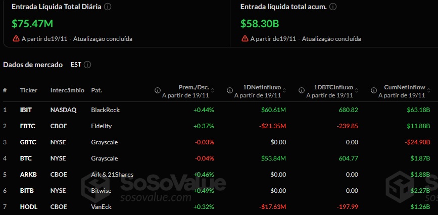 Na quarta-feira, 19 de novembro, os ETFs de Bitcoin listados nos EUA registraram um total de US$ 75,47 milhões em entradas líquidas. O iShares Bitcoin Trust (IBIT), da BlackRock, liderou os aportes com US$ 60,61 milhões. Esse resultado veio um dia após o fundo ter sofrido uma saída recorde de US$ 523 milhões.