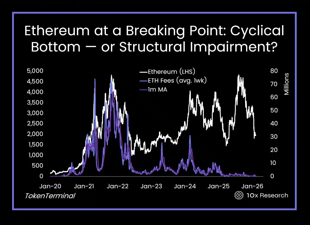 A pesquisa da 10x Research reforça esse diagnóstico. O grupo afirmou que o Ethereum agora opera próximo de níveis que ajudam a determinar se o movimento atual representa apenas uma fase cíclica ou algo mais profundo. Portanto, analistas pedem maior atenção ao comportamento dos grandes investidores.