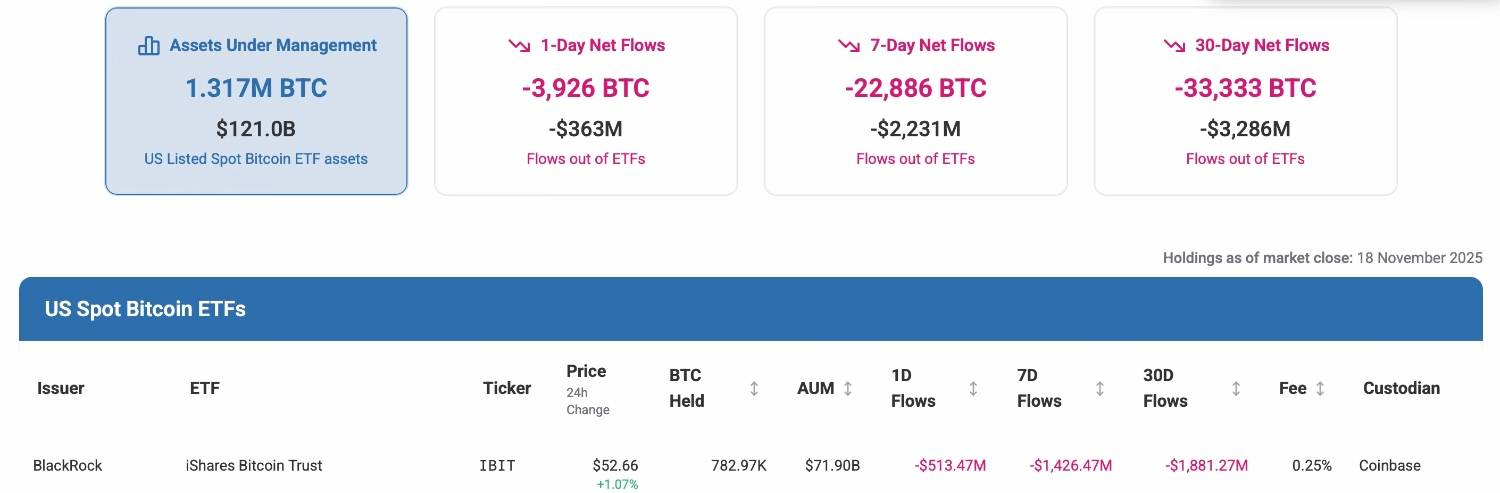 Atualmente, as reservas líquidas de Bitcoin da BlackRock chegam a US$ 71,9 bilhões, equivalentes a cerca de 3,9% de toda a oferta da criptomoeda. Apesar do peso, a gestora continua reduzindo exposição. Ao mesmo tempo, outros ETFs de Bitcoin perderam 3.926 BTC nos últimos sete dias, avaliados em US$ 363 milhões. No acumulado de novembro, as saídas já ultrapassaram 22.886 BTC, ou US$ 2,23 bilhões.