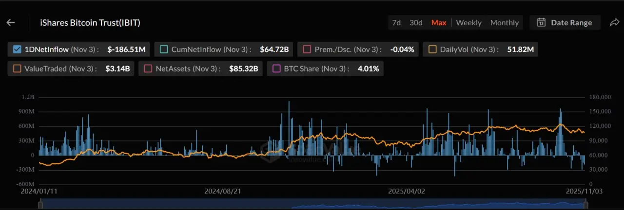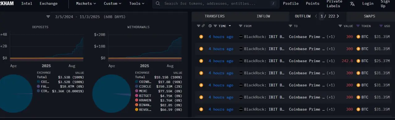 Dados da Arkham Intelligence indicam que, em 31 de outubro, a gestora enviou 3.496 BTC (US$ 383,9 milhões) e 31.754 ETH (US$ 122 milhões). No dia seguinte, mais US$ 506 milhões em ativos digitais foram transferidos. O montante coincide com saídas superiores a US$ 1 bilhão dos ETFs iShares Bitcoin Trust (IBIT) e iShares Ethereum Trust (ETHA), reforçando a hipótese de operações internas de custódia.