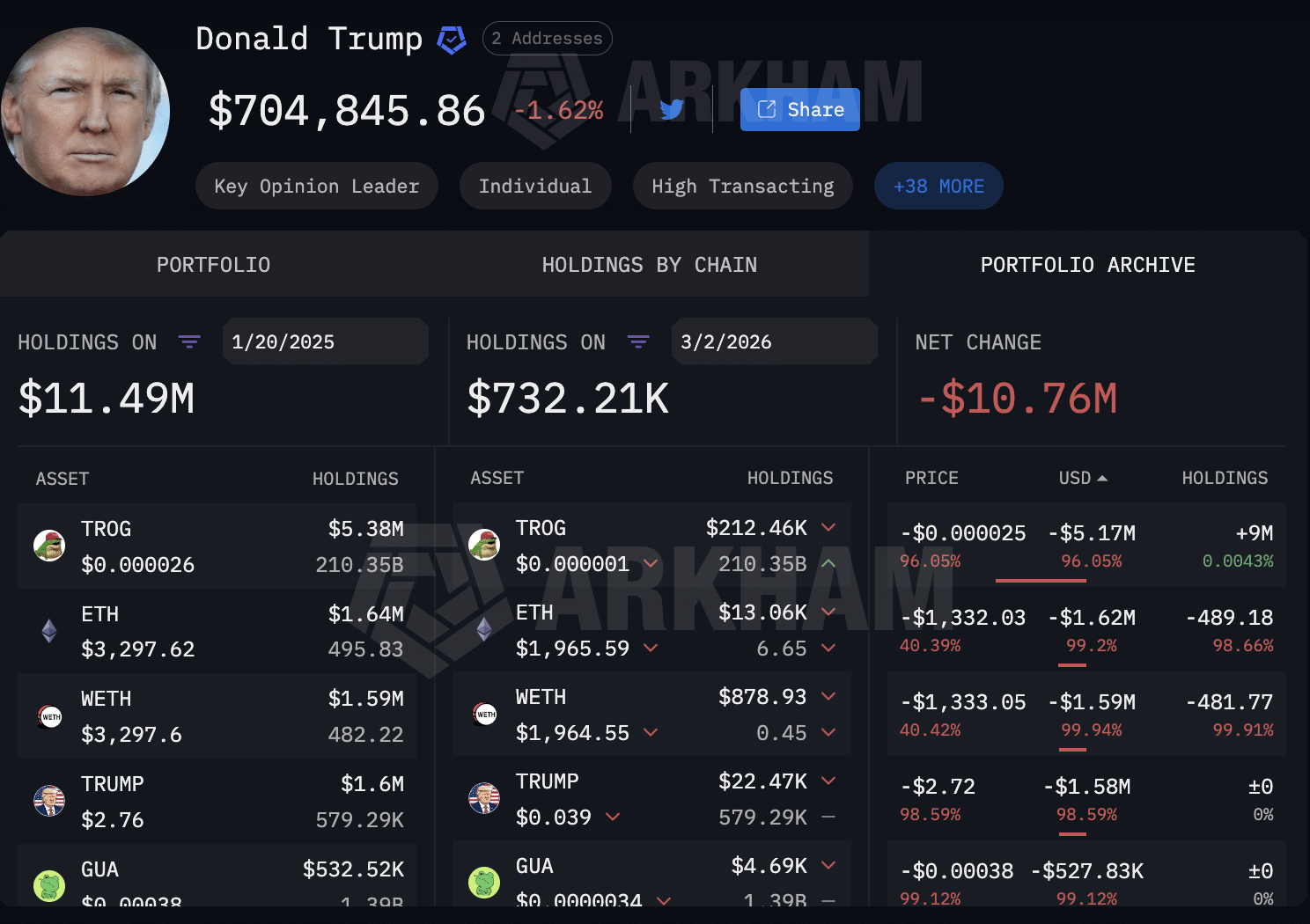 Relatórios da Arkham Intelligence mostram que a carteira atribuída a Trump atingiu US$ 11,49 milhões no dia 20 de janeiro de 2025. Desde então, o valor caiu para US$ 704.845, revelando uma diminuição de 94%. Esse recuo inclui perdas profundas em vários tokens associados a sua imagem.