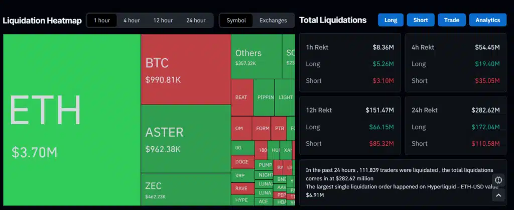 Essa disparidade aparece em números amplos. Nas últimas 24 horas, o mercado viu mais de US$ 660 milhões liquidados, segundo a CoinGlass. A pressão vem do ambiente macroeconômico, que segue instável e reduz o apetite por risco em todo o setor financeiro global.