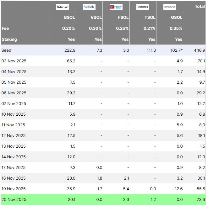 Entradas de capital no ETF Solana em novembro. Fonte: Farside Investors