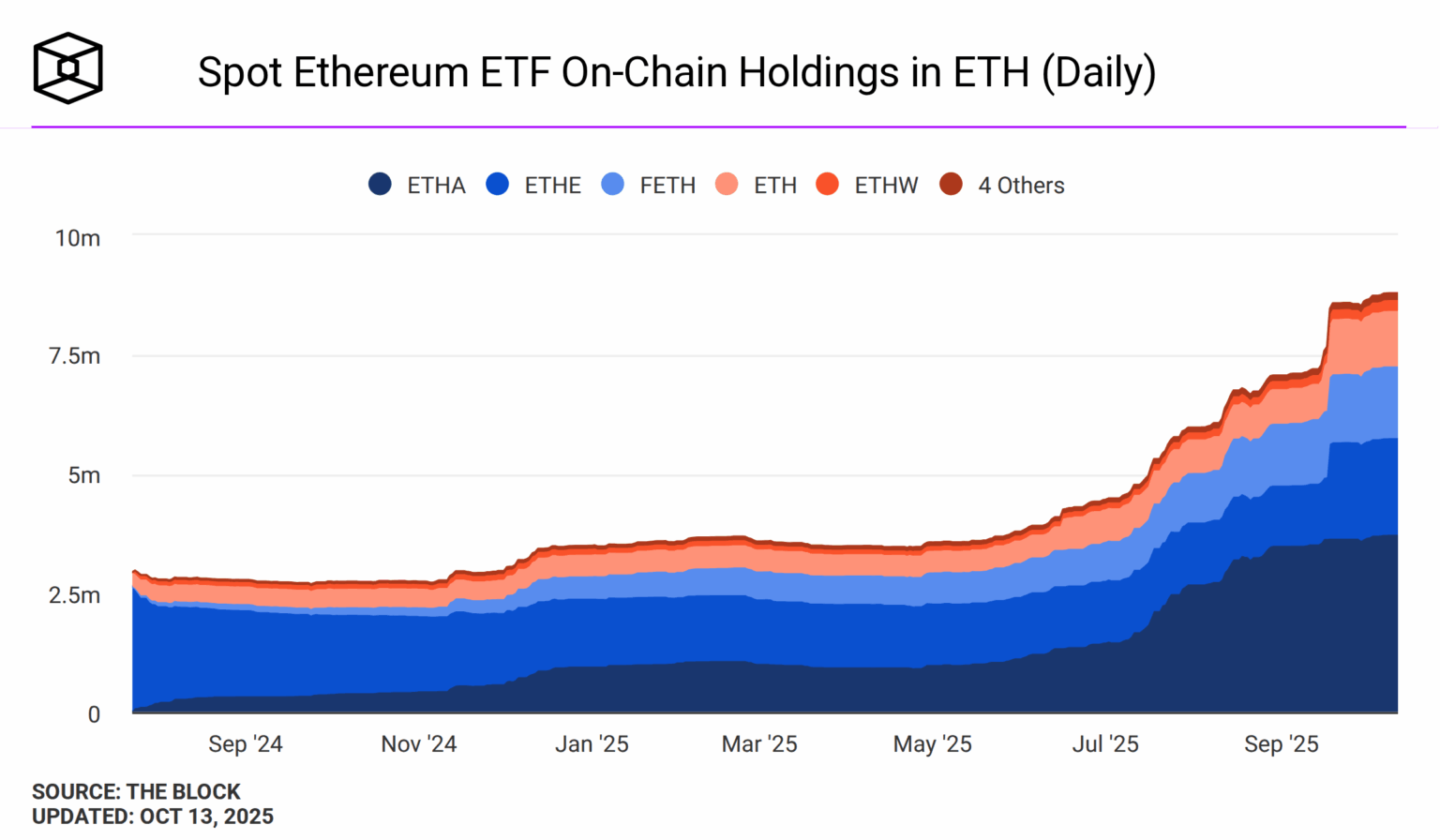 Esse interesse já aparece nos números. A Ark Investments revelou que os fundos de Ethereum negociados em bolsa (ETFs) nos Estados Unidos já absorveram mais de 6,8 milhões de ETH, avaliados em cerca de US$ 28 bilhões.