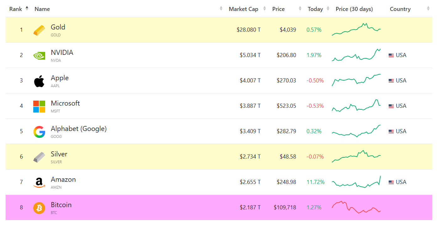Com o passar dos anos, o Bitcoin deixou de ser uma curiosidade tecnológica para se tornar o oitavo ativo mais valioso do planeta — atrás apenas de gigantes como ouro, prata e Amazon, segundo dados da CompaniesMarketCap.