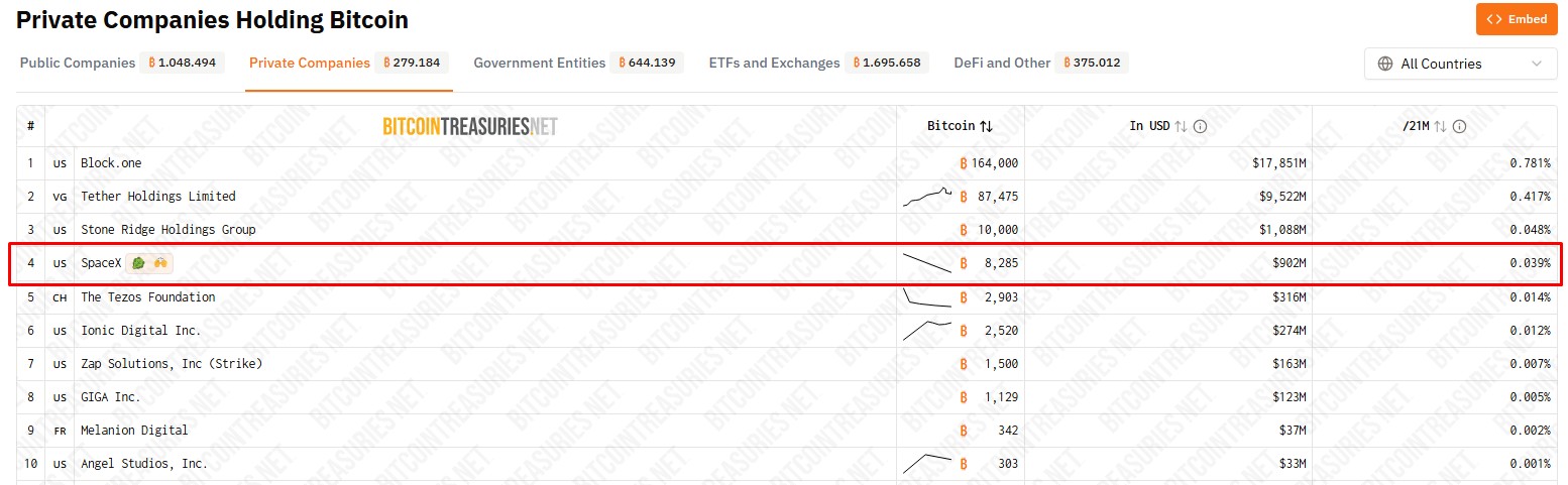 Atualmente, a SpaceX aparece como a quarta maior empresa privada detentora de Bitcoin, ficando atrás apenas de Block.one, Tether e Stone Ridge. Apesar de Musk não falar muito sobre o ativo nos últimos anos, essas reservas demonstram que sua confiança no potencial do Bitcoin continua firme.