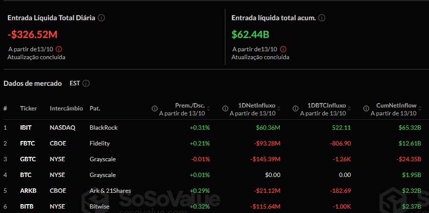 Em primeiro lugar, os ETFs de Bitcoin perderam US$ 326,52 milhões em capital. Embora o setor tenha se mostrado resiliente em semanas anteriores, a pressão vendedora foi evidente. O Grayscale Bitcoin Trust (GBTC) liderou as saídas, com US$ 145,39 milhões retirados. Logo atrás, o fundo FBTC, da Fidelity, sofreu perdas de US$ 93,28 milhões. Além disso, os ETFs da Ark 21Shares (ARKB) e Bitwise (BITB) perderam mais de US$ 136 milhões juntos.