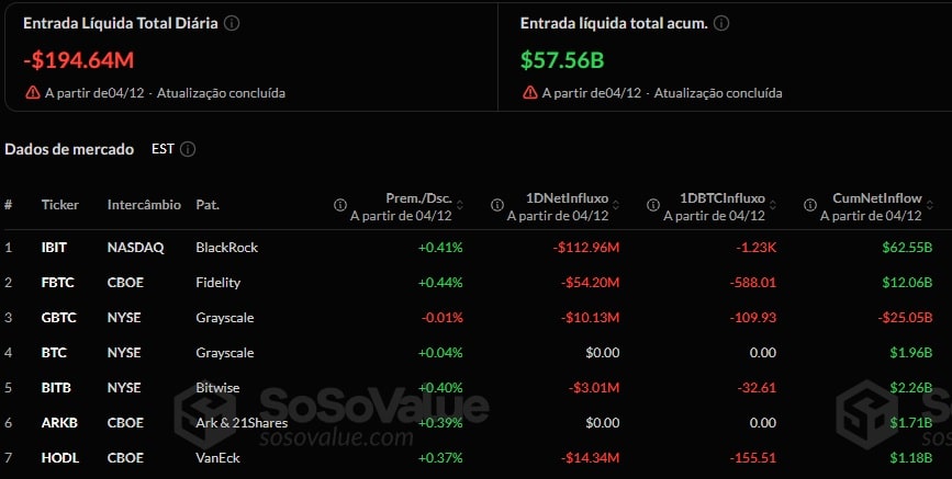 Os ETFs spot de Bitcoin listados nos EUA registraram saídas líquidas de US$ 194,6 milhões nesta quinta-feira, a maior retirada líquida dos últimos quatorze dias. A movimentação evidencia nervosismo entre investidores institucionais diante da recente instabilidade nos preços do BTC.