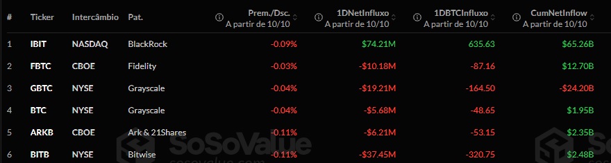 Além disso, o fundo IBIT, da BlackRock, destacou-se como o líder absoluto do período. Ele registrou US$ 74,2 milhões em entradas diárias e atingiu um total de US$ 65,26 bilhões em ativos sob gestão.