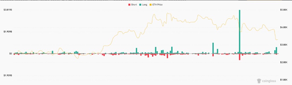 Já em 22 de setembro, US$ 955 milhões em posições compradas desapareceram. Entre 22 e 25 de setembro, o ETH recuou de US$ 4.458 para US$ 3.825.