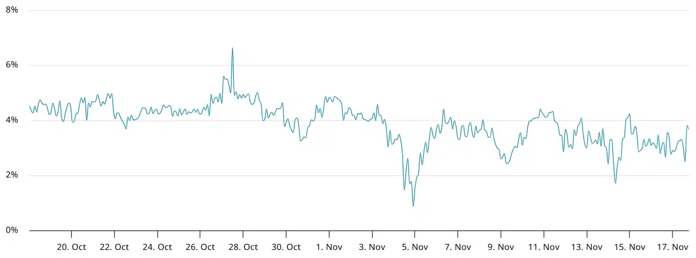 A demanda por alavancagem otimista em ETH permaneceu fraca por semanas. O prêmio dos futuros segue abaixo do patamar neutro de 5%, o que confirma a hesitação dos traders. Esse comportamento também afeta empresas com grandes reservas de ETH, como Bitmine Immersion, SharpLink Gaming e The Ether Machine. Todas sofrem com quedas nas ações negociadas abaixo do valor patrimonial líquido, movimento que diminui o interesse por novas dívidas e aumenta a preocupação com possíveis diluições.