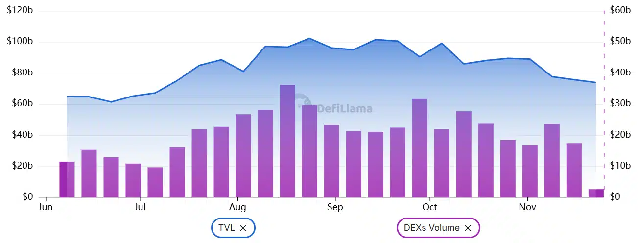 O valor total bloqueado (TVL) do Ethereum caiu para US$ 74 bilhões, menor nível em quatro meses. A queda de 13% em 30 dias reflete menor confiança dos usuários. Nas DEXs, o volume semanal atingiu US$ 17,4 bilhões, uma redução de 27%. Embora o Ethereum siga líder em depósitos, a disputa por volume ficou mais acirrada diante do avanço de rivais como Solana e BNB Chain.