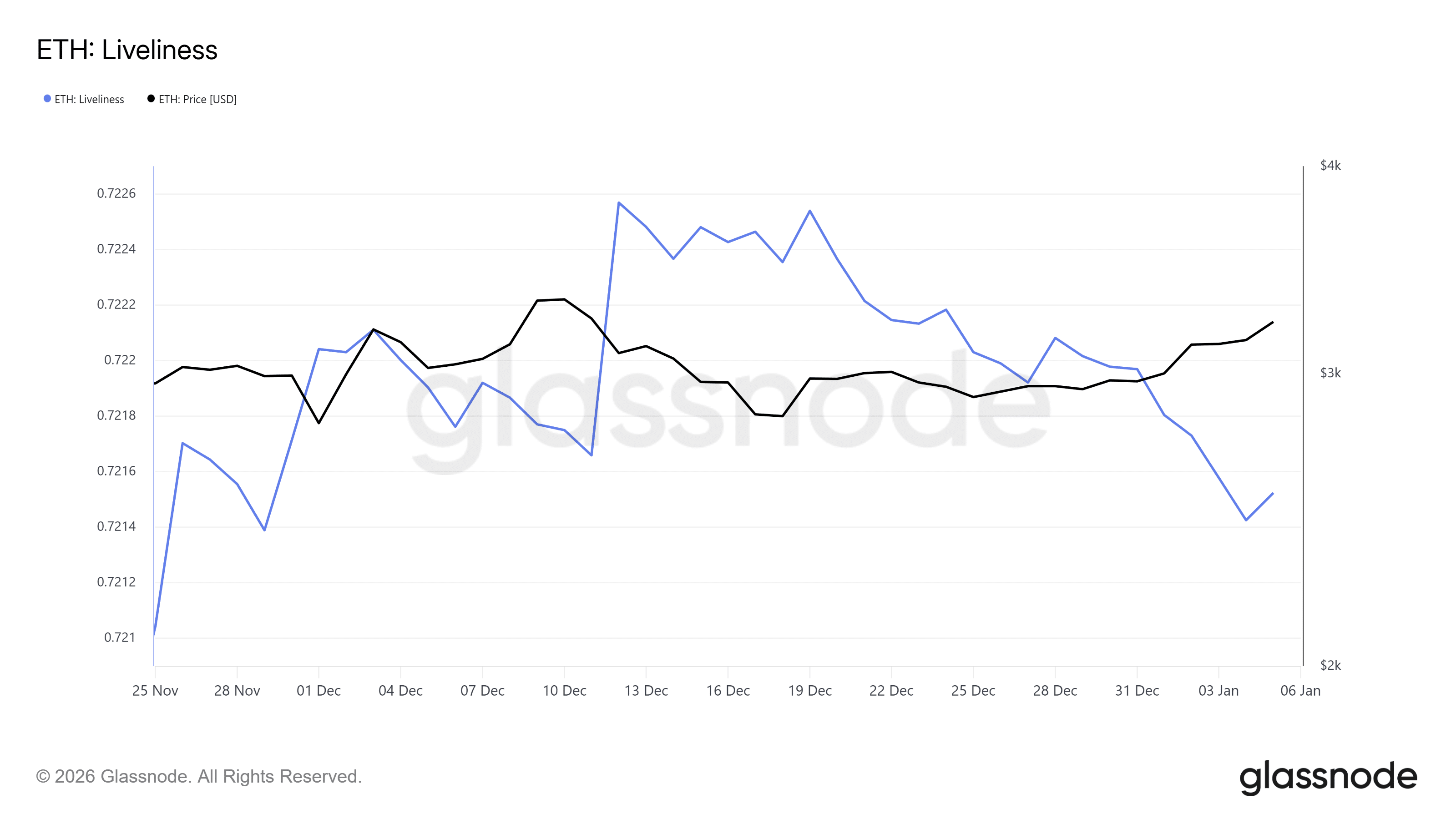 Enquanto as baleias vendem, os investidores de longo prazo exibem comportamento oposto. O índice Liveliness do Ethereum caiu desde o fim de dezembro, indicando retenção de moedas por parte desse grupo.