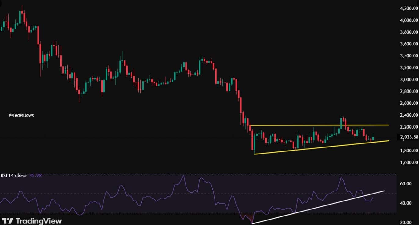 O gráfico diário mostra que o Ethereum forma uma cunha ascendente desde a queda registrada em fevereiro. O padrão indica recuperação lenta, porém sem força suficiente.