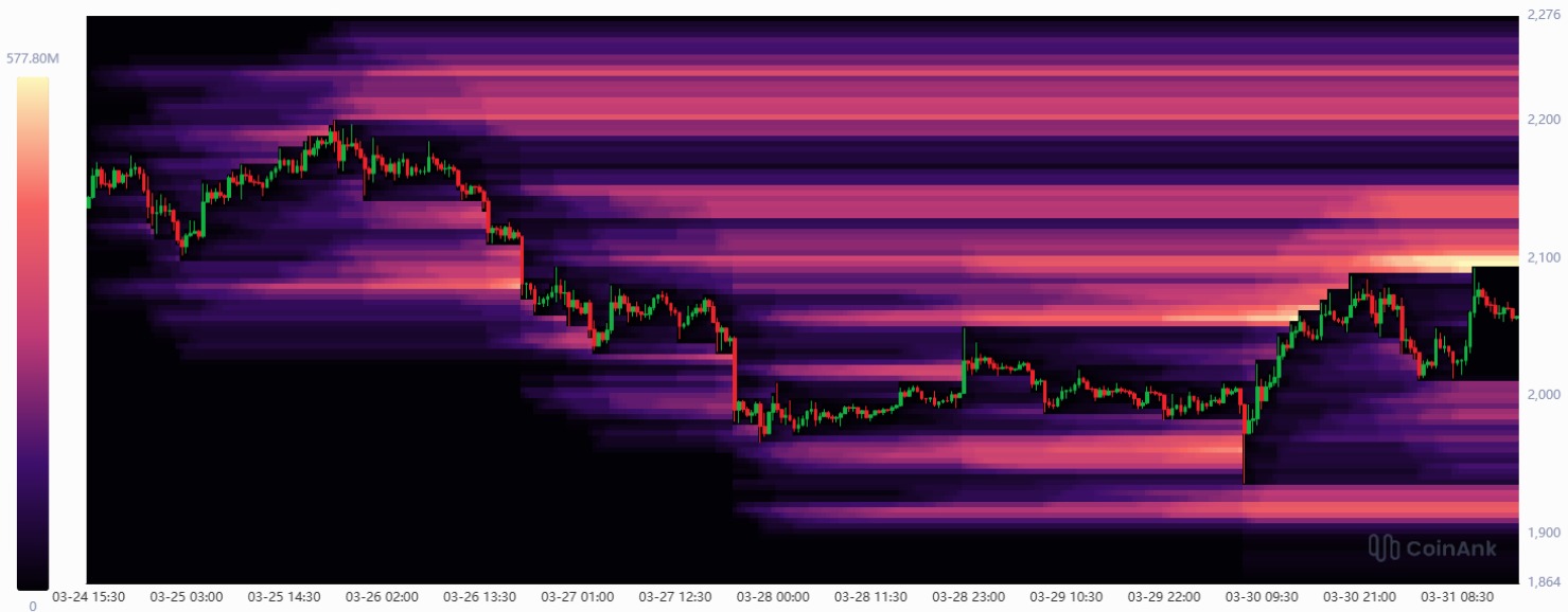 Além da análise técnica, os dados de liquidez reforçam o alerta. Um mapa de calor da CoinAnk mostra um grande aglomerado de liquidações próximo de US$ 2.100.