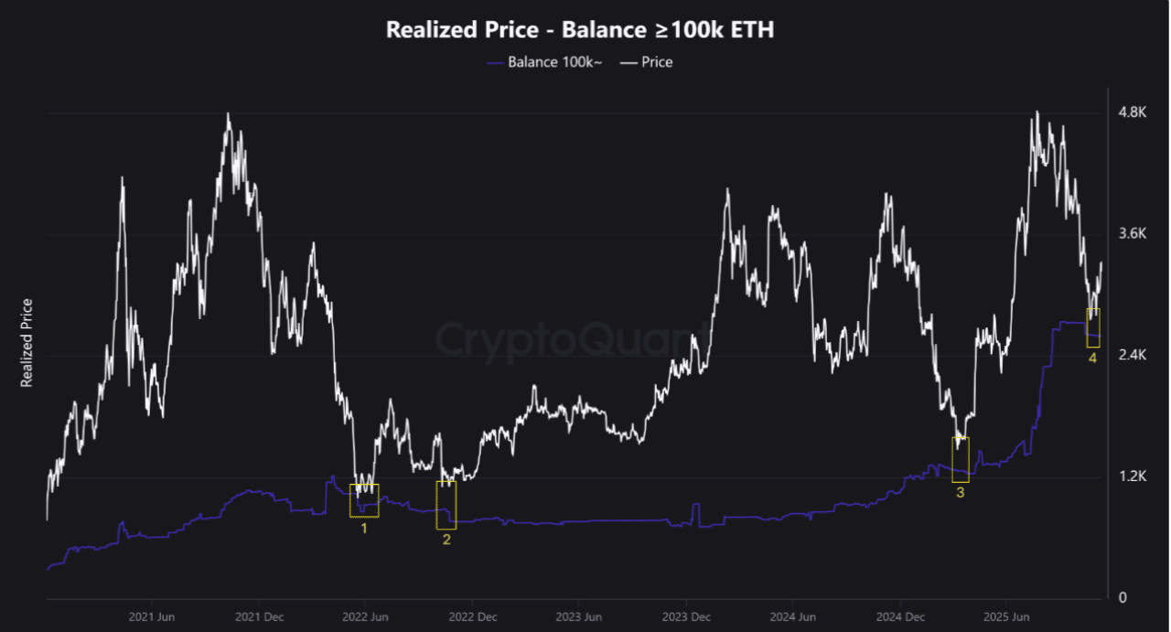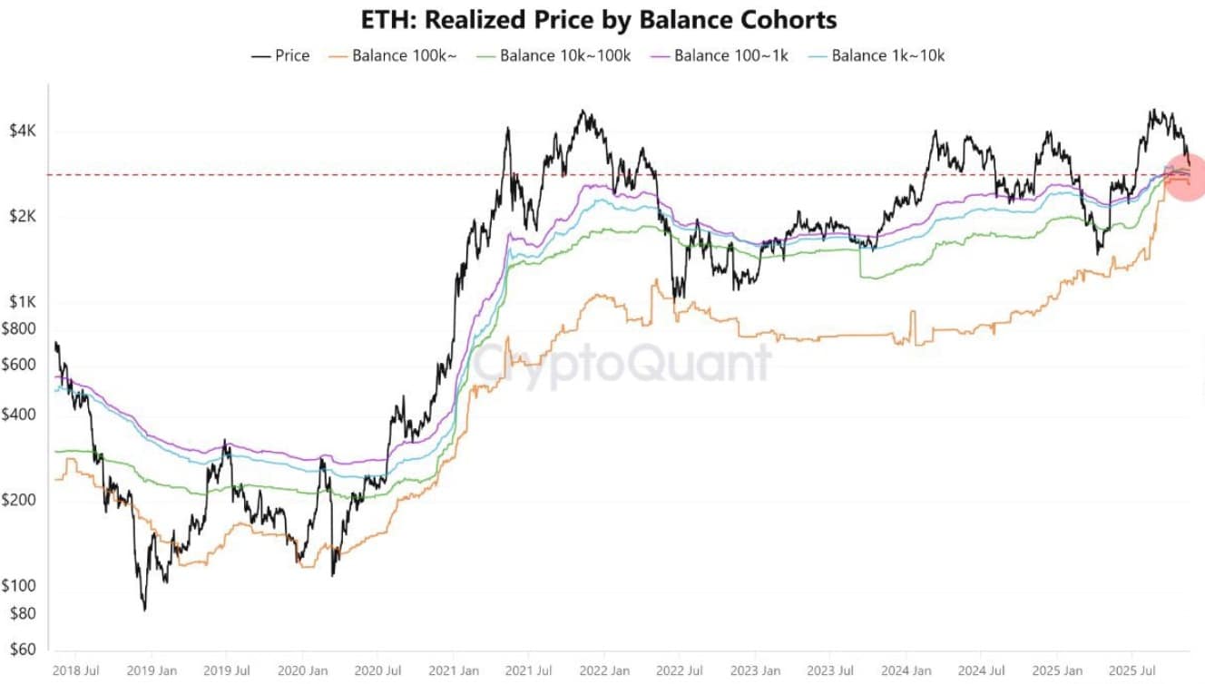 ETH se aproxima de um nível decisivo. O Ether caiu cerca de 45% desde o pico de outubro, quando atingiu US$ 4.758, e despencou até US$ 2.621 em 21 de novembro. Mesmo assim, o movimento levou o preço para perto do preço realizado das baleias, indicador que mostra quanto investidores com mais de 100.000 ETH pagaram, em média, pelo ativo. Esse ponto costuma funcionar como base para recuperações importantes.