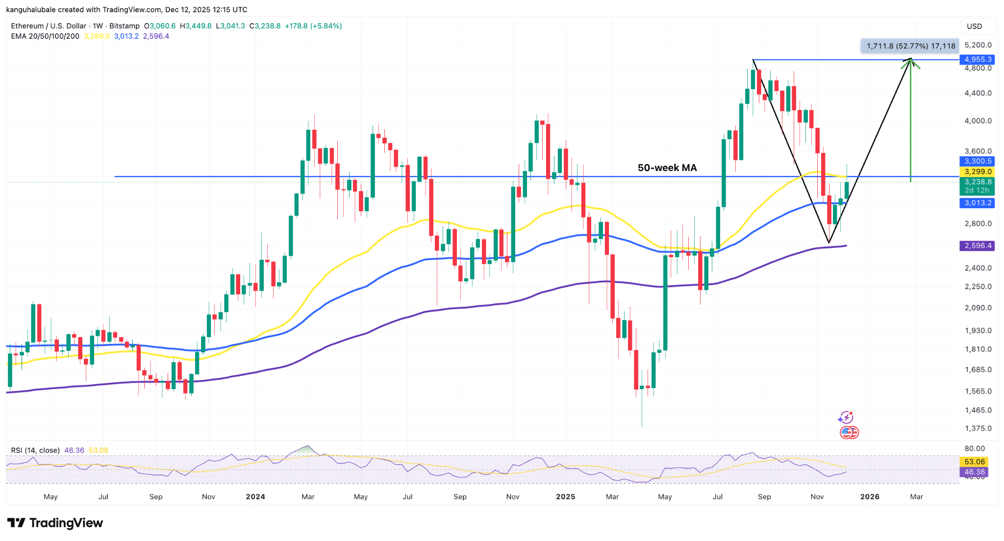 Padrão em V alimenta projeções otimistas. Depois do toque no suporte, o ETH reagiu rapidamente e avançou 23,5%, chegando a US$ 3.238. Agora, o ativo testa a SMA de 50 semanas, perto de US$ 3.300, ponto que funciona como barreira antes de um possível avanço mais forte. Se os compradores romperem esse nível, o preço poderá mirar a resistência em US$ 4.955, movimento que completaria um padrão de recuperação em forma de V no gráfico semanal.