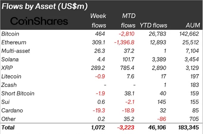 • Os produtos referenciados em Bitcoin lideraram o avanço, recebendo aproximadamente US$ 464 milhões