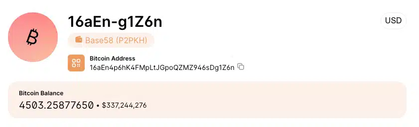O endereço blockchain apresentado mostra 4.503 BTC, equivalentes a US$ 334 milhões nos valores atuais. A última transação registrada data de novembro de 2025, indicando que os fundos permanecem intocados há meses.