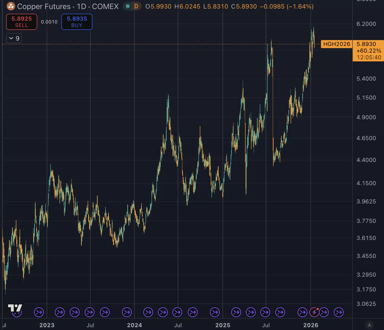 O metal atingiu um recorde histórico de US$ 6,06 por libra, em 14 de janeiro, movimento que coincidiu com forte atividade nos mercados futuros. Mesmo assim, o avanço não ocorreu em uma única onda, mas em um processo contínuo. A COMEX registrou volume de 74.332 contratos, abaixo do dia anterior, mas com interesse em aberto maior, chegando a 269.825 posições.