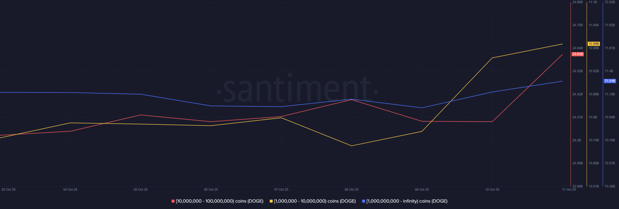 As chamadas baleias, grandes detentoras de capital, começaram a acumular DOGE e PEPE. Segundo dados on-chain, uma única baleia convertou US$ 4,97 milhões em USDT para comprar 600 bilhões de PEPE, mantendo ainda US$ 1 milhão em USDC como reserva para novas compras. Ao mesmo tempo, as carteiras associadas ao Dogecoin adicionaram cerca de 550 milhões de DOGE desde a última queda, o maior acúmulo desde setembro.